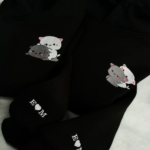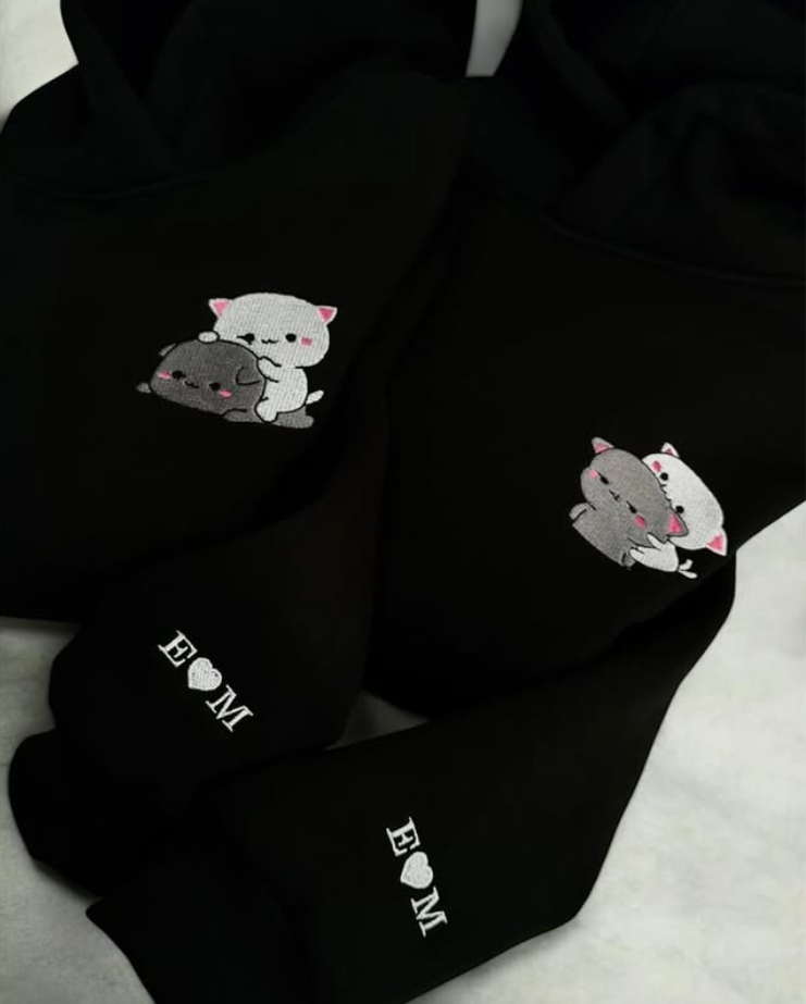 This hoodie design features embroidered cute hugging cats along with personalized initials “E ❤️ M” on the sleeve. It gives off a cozy and romantic vibe, perfect for couple-themed apparel.